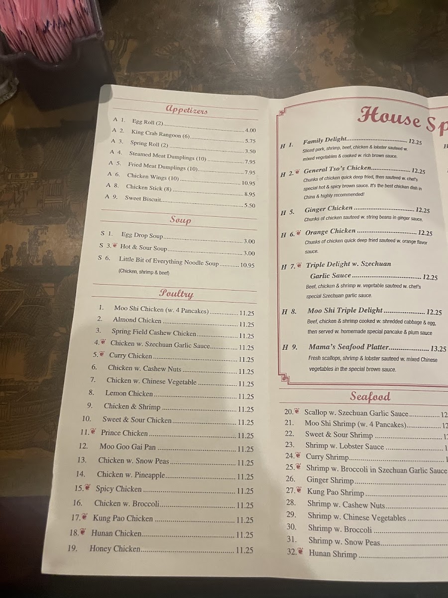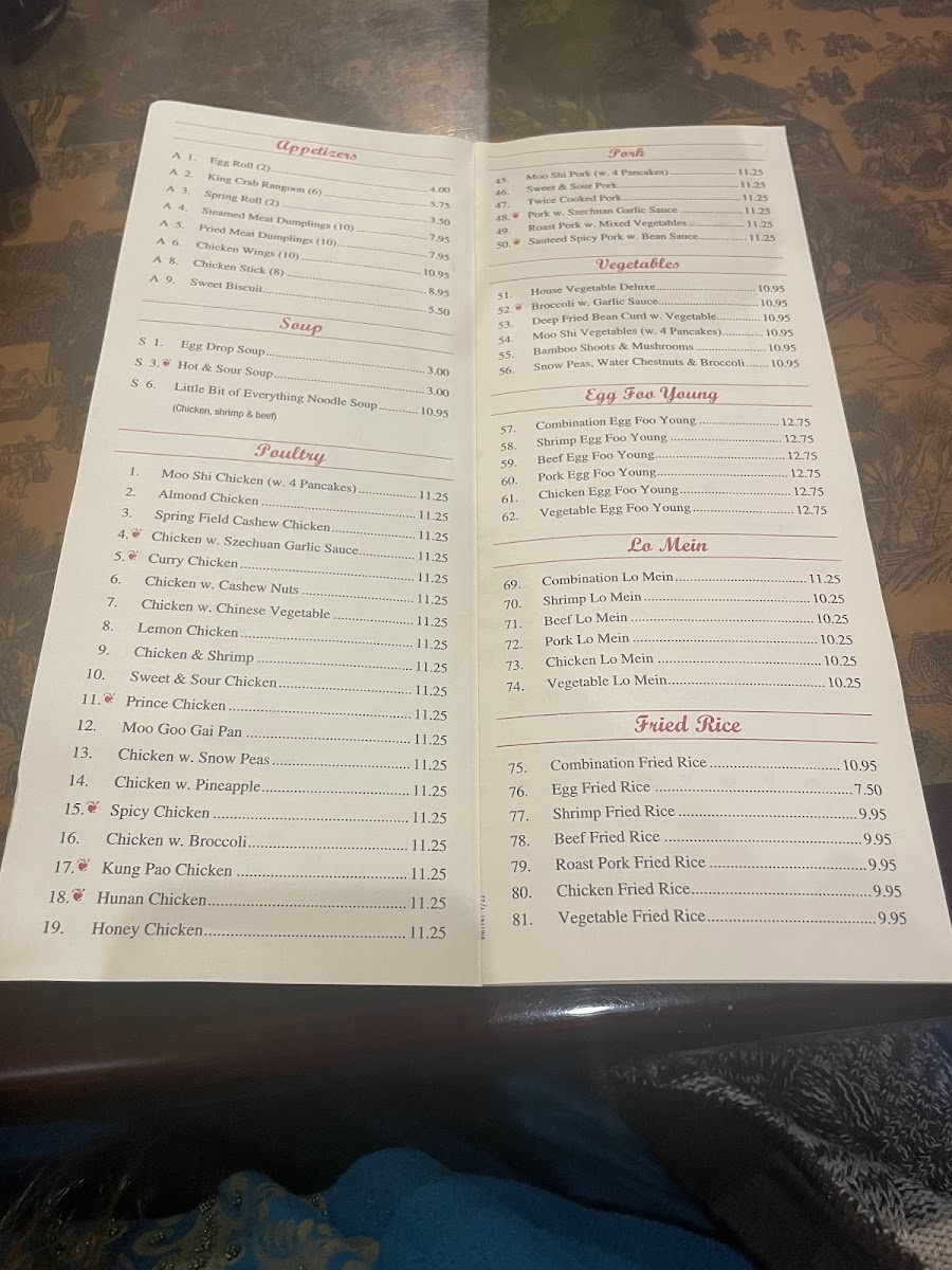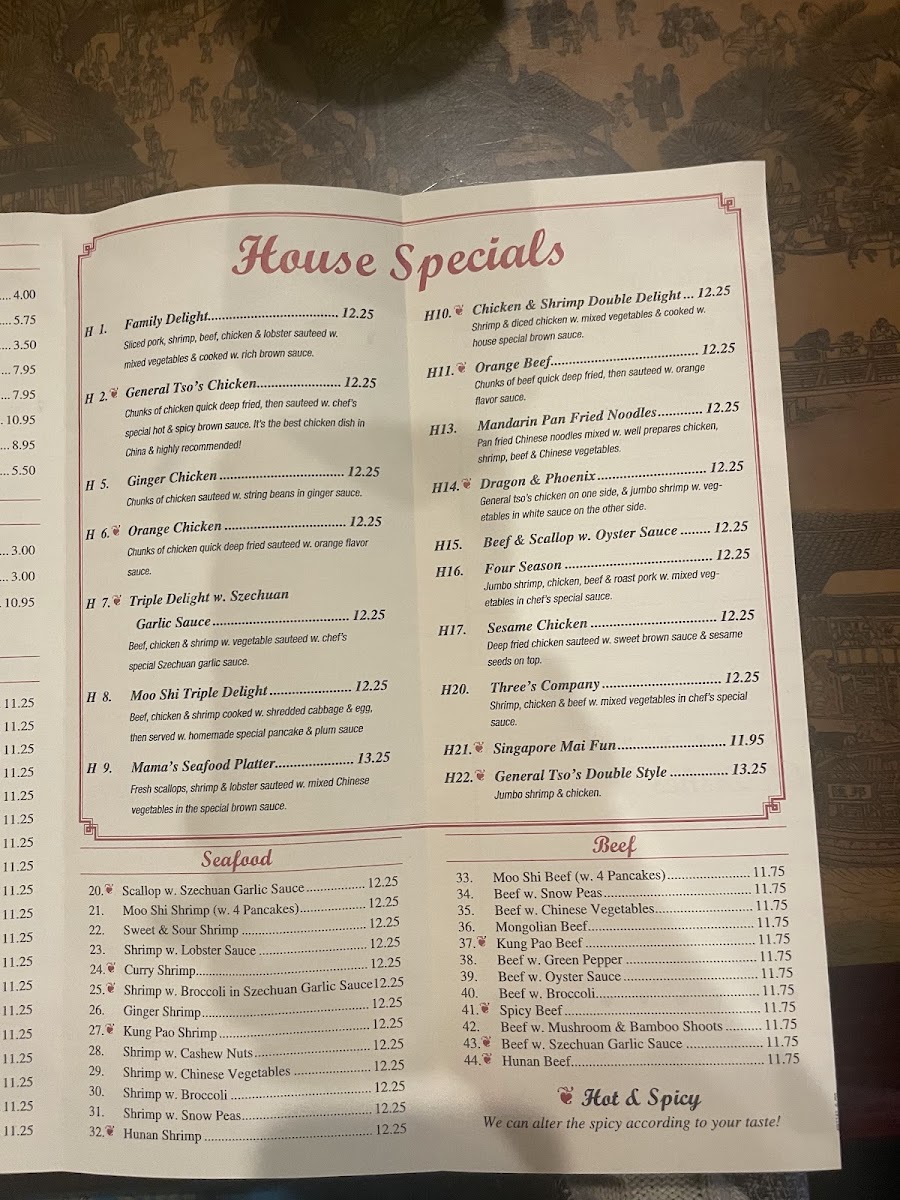 - Beef Dishes: Includes items such as Moo Shi Beef served with pancakes and Beef with Snow Peas.