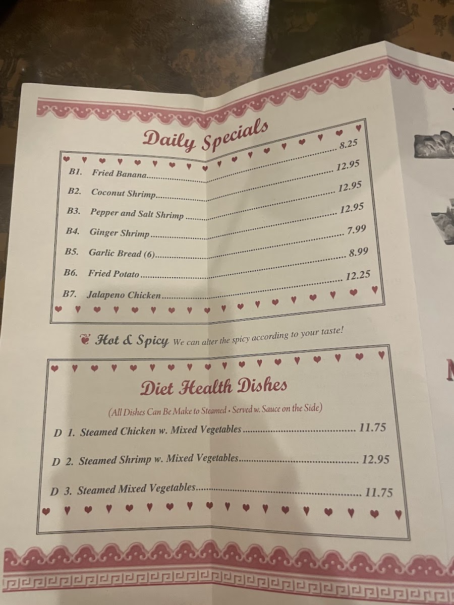 - Pork Dishes: Features choices such as Roast Pork with Mixed Vegetables and Moo Shi Pork served with pancakes.