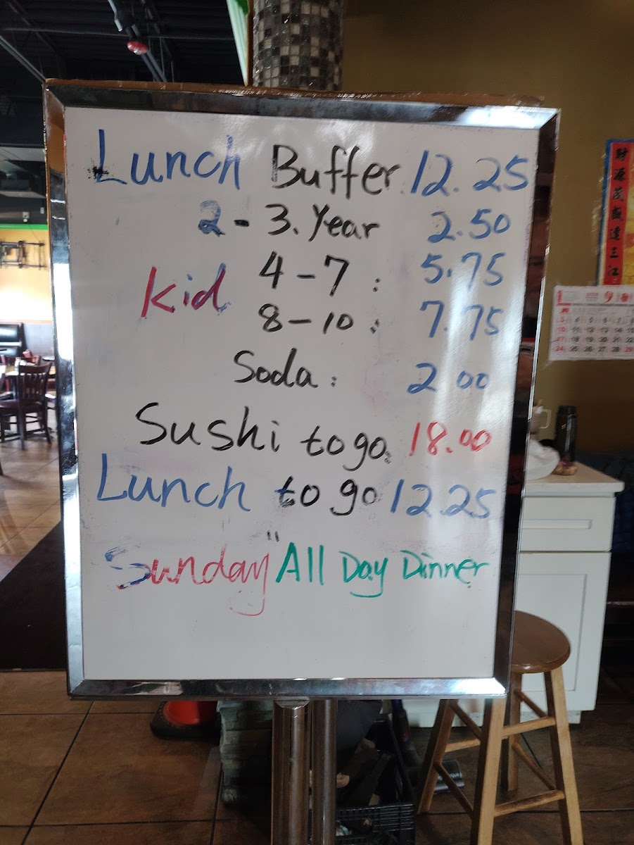 The menu features a diverse selection of Asian cuisine with a focus on Chinese, Japanese, and sushi dishes. It is structured to accommodate various dining preferences, including à la carte options and an all-you-can-eat buffet.